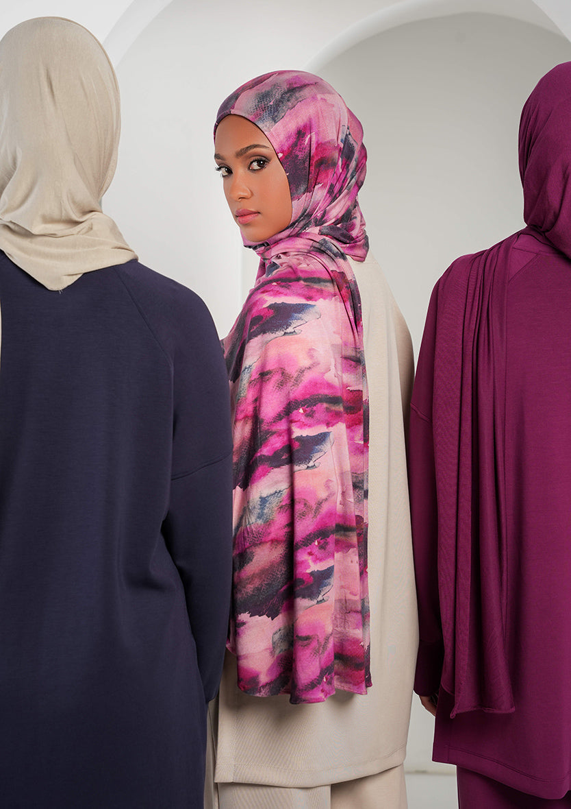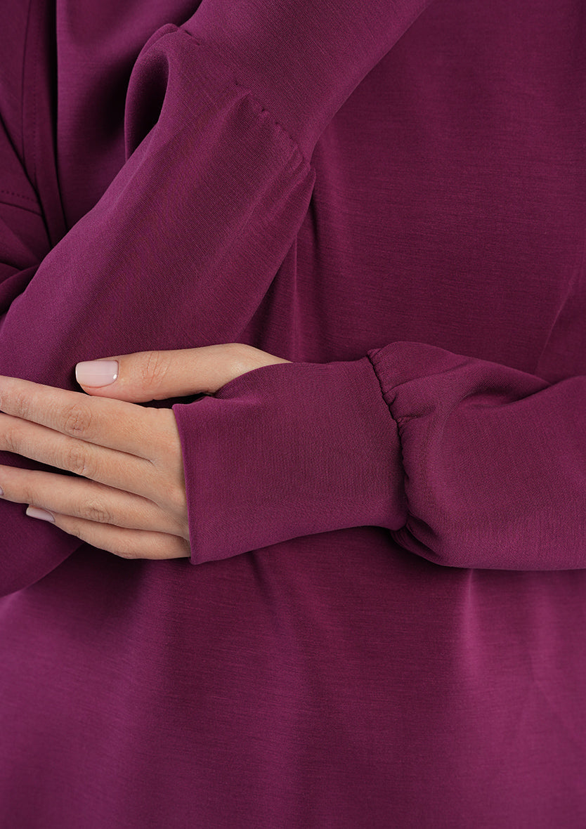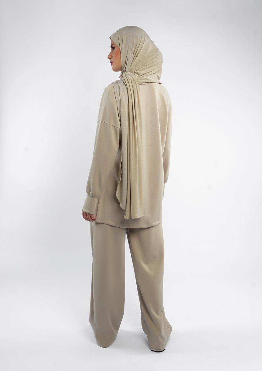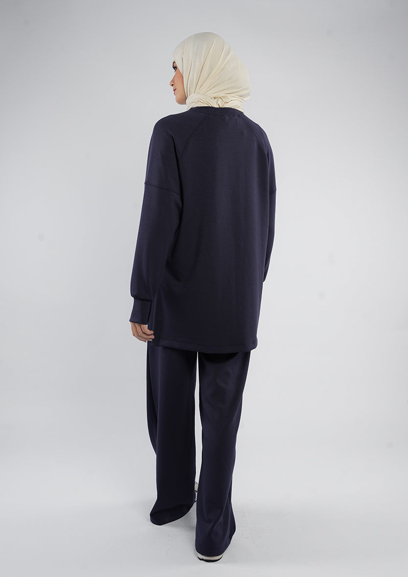 Long sweatshirt and matching wide-leg pants set in premium modal scuba that feels extra-soft, breathable, and naturally cooling on the skin. The top is cut with relaxed drop shoulders and a modest high-low hem that falls longer at the back for extra coverage, with side slits for ease of movement and a flattering drape.